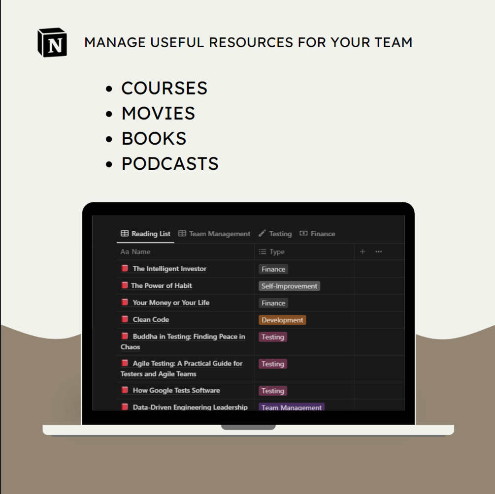 - Useful Resources: A page for keeping track of important resources such as books, articles, and videos that team members should read or watch.