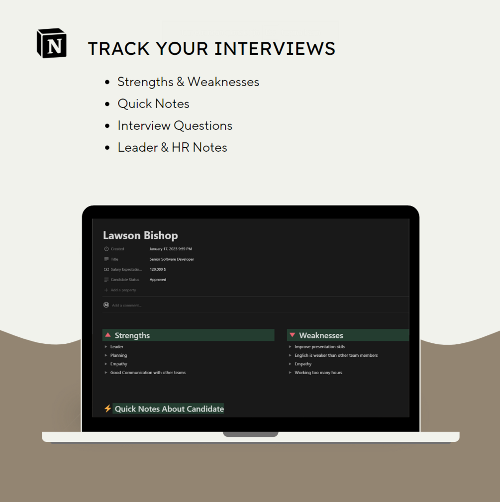 - Interview Notes: A page for recording and tracking notes from job candidate interviews.